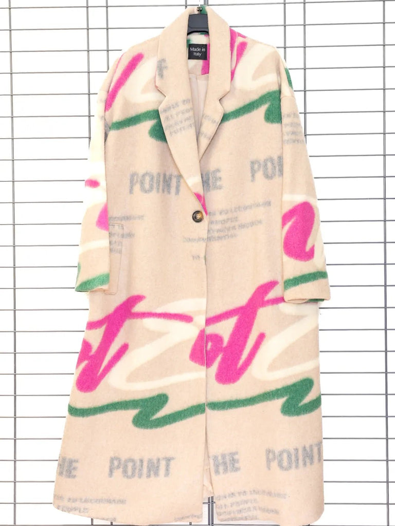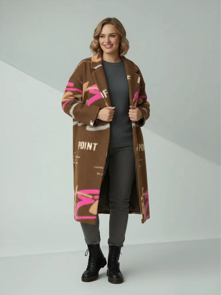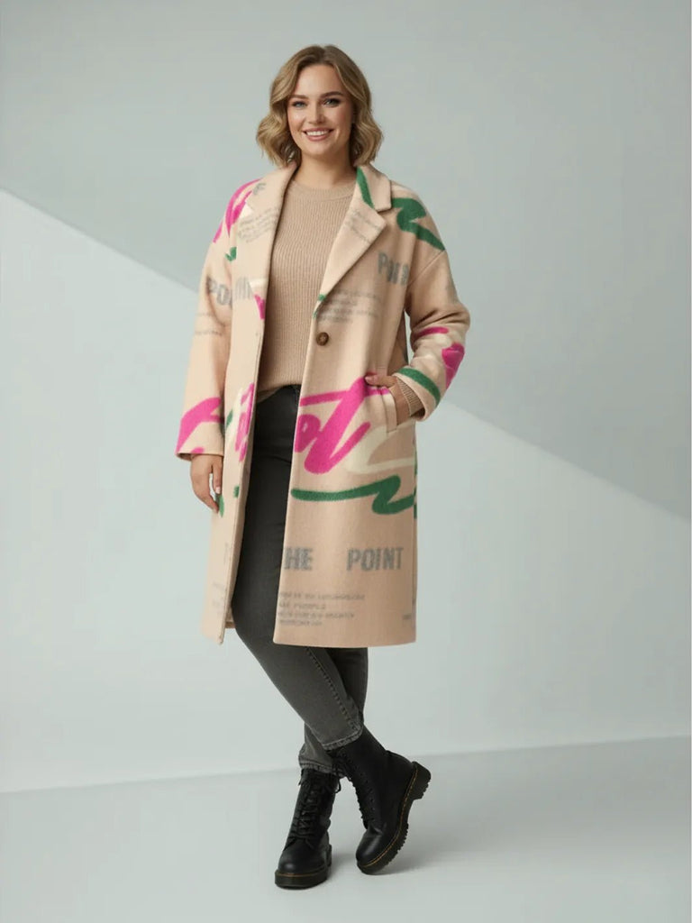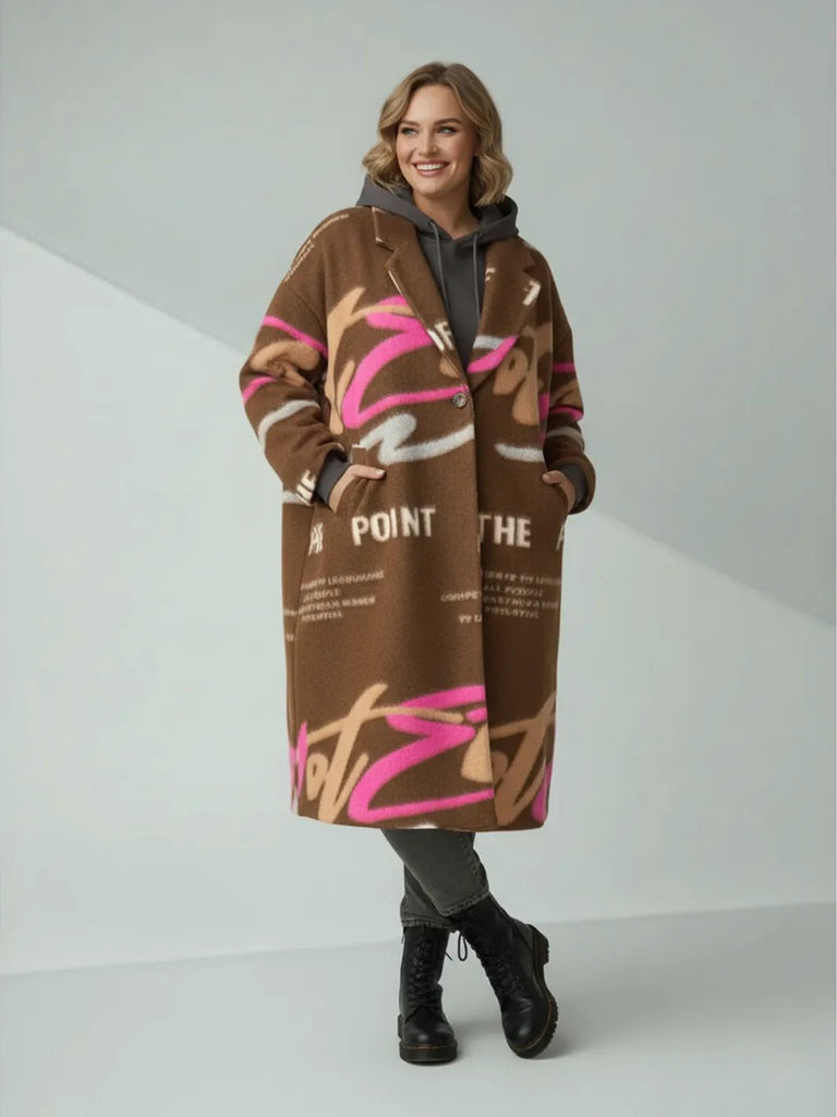Dieser Mantel mit Schriftzug bringt genau die Portion Selbstbewusstsein in deine Garderobe, die du liebst! Ein Highlight für alle, die Mode in Großen Größen mit Charakter und Ausdruck suchen. Der coole Allover-Print in modernen Farbtönen und die edle Filzoptik machen diesen Mantel zum echten Eye-Catcher für Herbst und Winter.