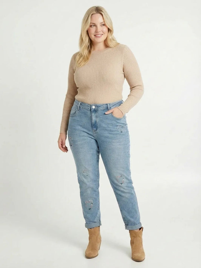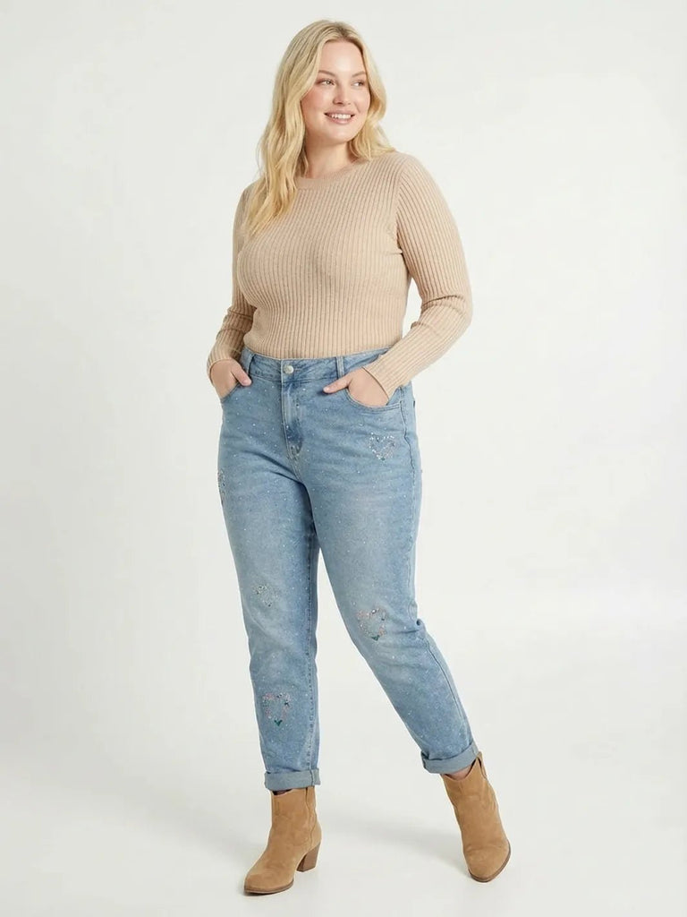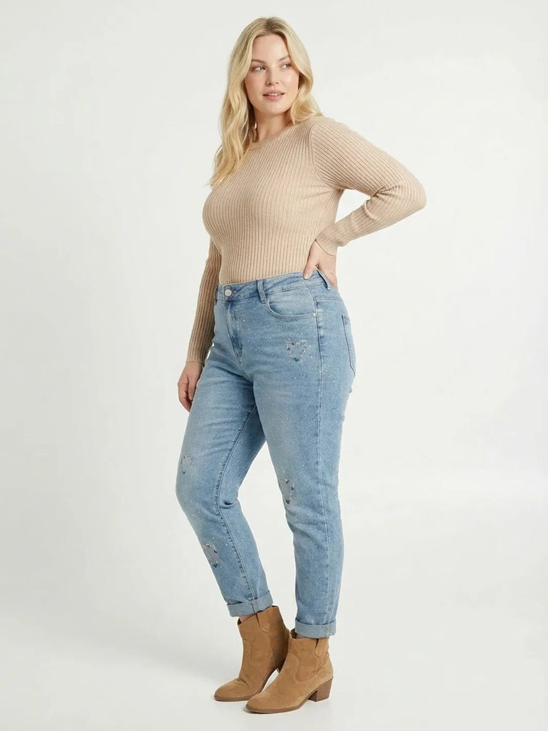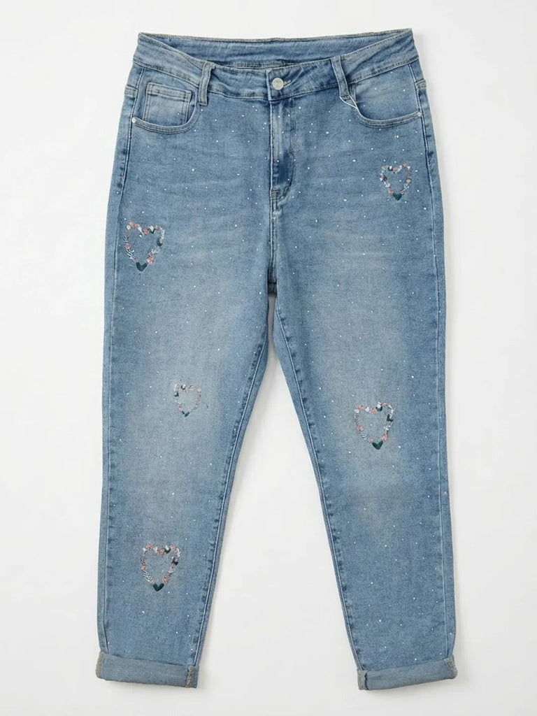 Jeans mit Strassdekor & Herz-Stickerei – Mom Fit in Große Größen