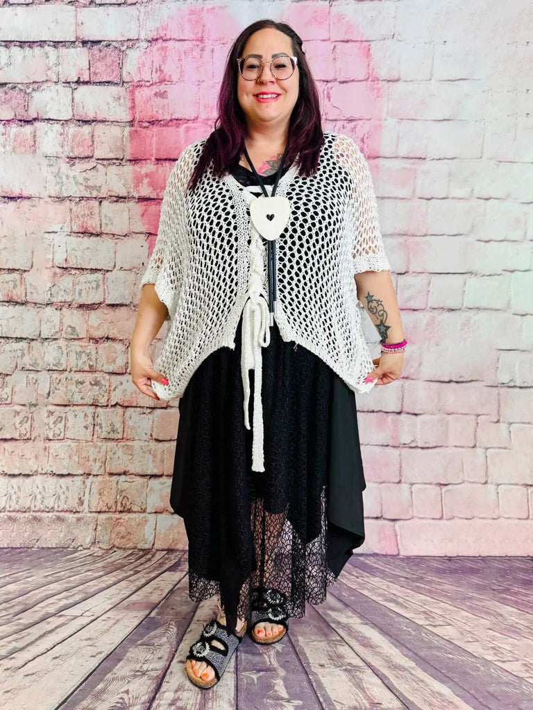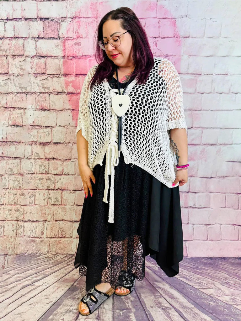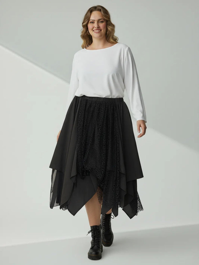 Ein absolutes Highlight für alle, die zeitlose Curvy Mode mit einem Hauch Extravaganz lieben! 💫 Dieser schwarze Rock von Moonshine kombiniert fließende Stoffe mit einem raffinierten Netzdekor und asymmetrischem Zipfelschnitt – perfekt für elegante oder lässige Looks.