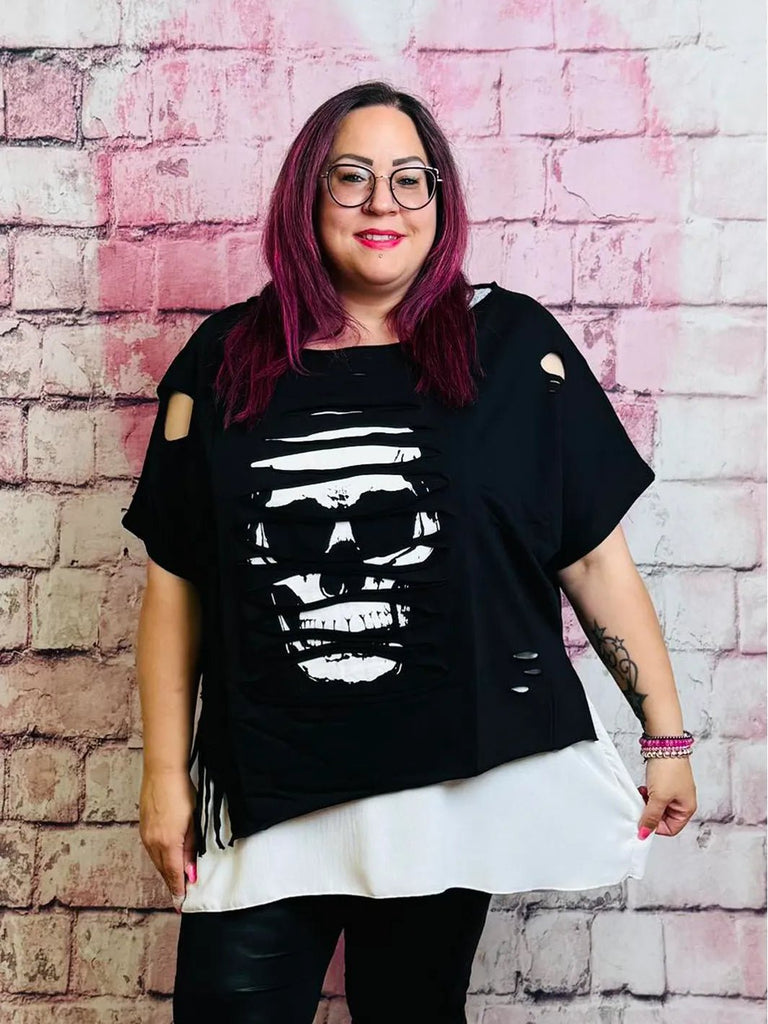 Du liebst es auffällig, individuell und mit einer Prise Rebellion? Dann ist dieses Skull Oberteil in Schwarz genau dein Ding! Die Boutique Ware vereint lässigen Oversize-Komfort mit einem coolen, rockigen Look – perfekt für Curvys in großen Größen, die ihren Stil leben wollen.