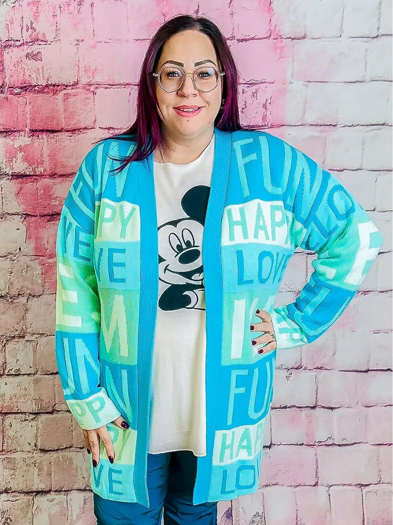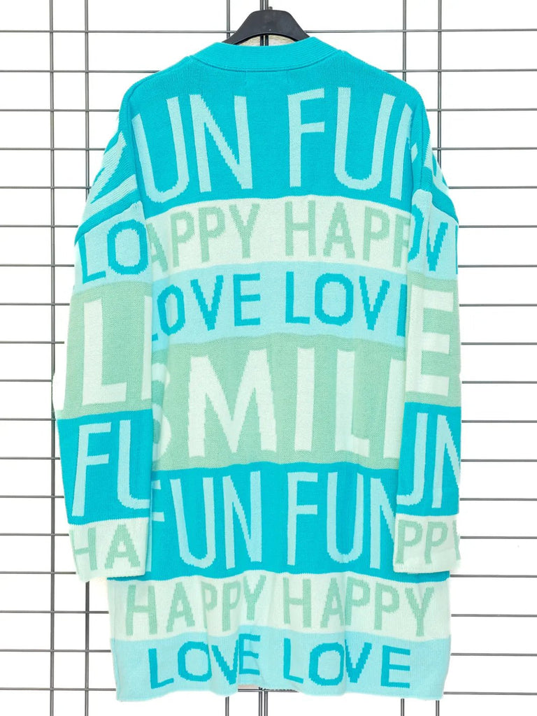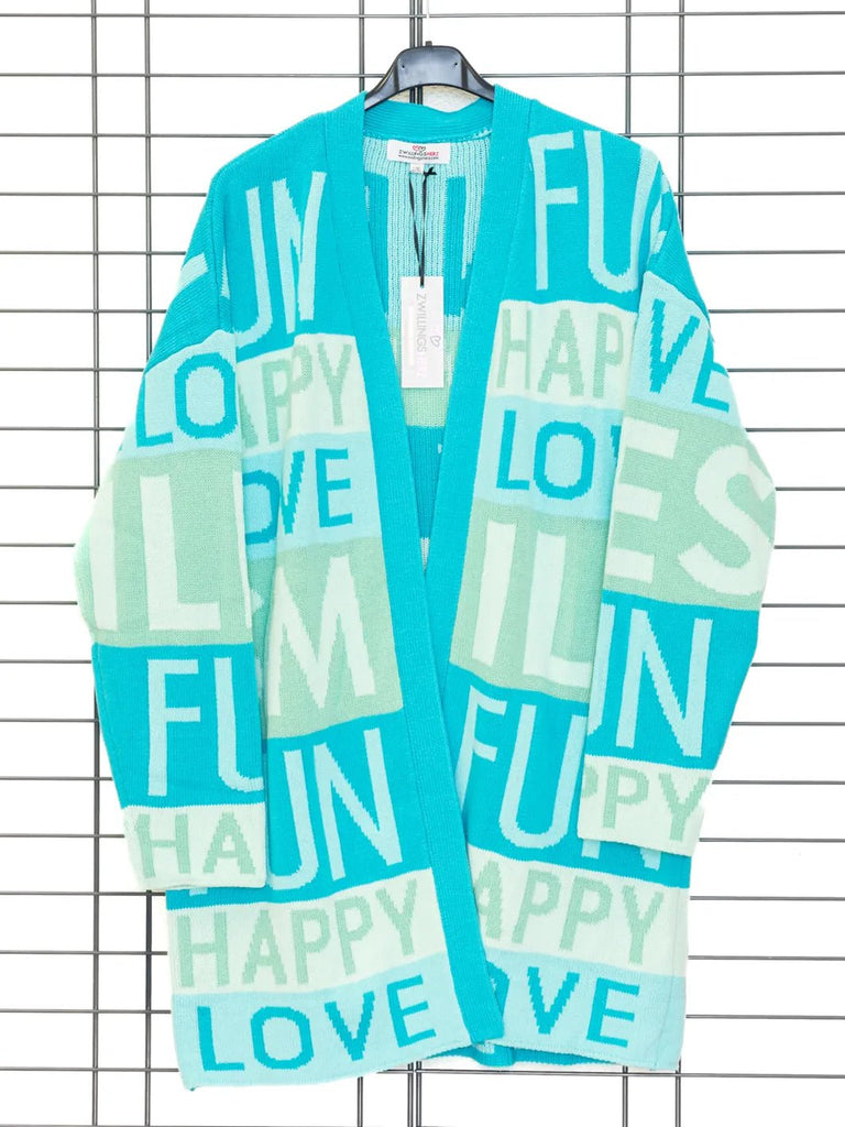 Verleihe deinem Outfit das gewisse Etwas mit dem Cardigan Words von Zwillingsherz! 💕 Dieser farbenfrohe Cardigan in Türkis- oder Pinkmix begeistert mit seinem auffälligen Schriftzug-Design, das Wörter wie "FUN", "HAPPY" und "LOVE" integriert. Dank seines offenen Schnitts ist er besonders vielseitig und schmeichelt jeder Figur. Die hochwertige Materialmischung aus Acryl und Baumwolle sorgt für ein angenehmes Tragegefühl, während der lockere Oversize-Look von Größe 44 bis 50/52 perfekt passt. 🧵