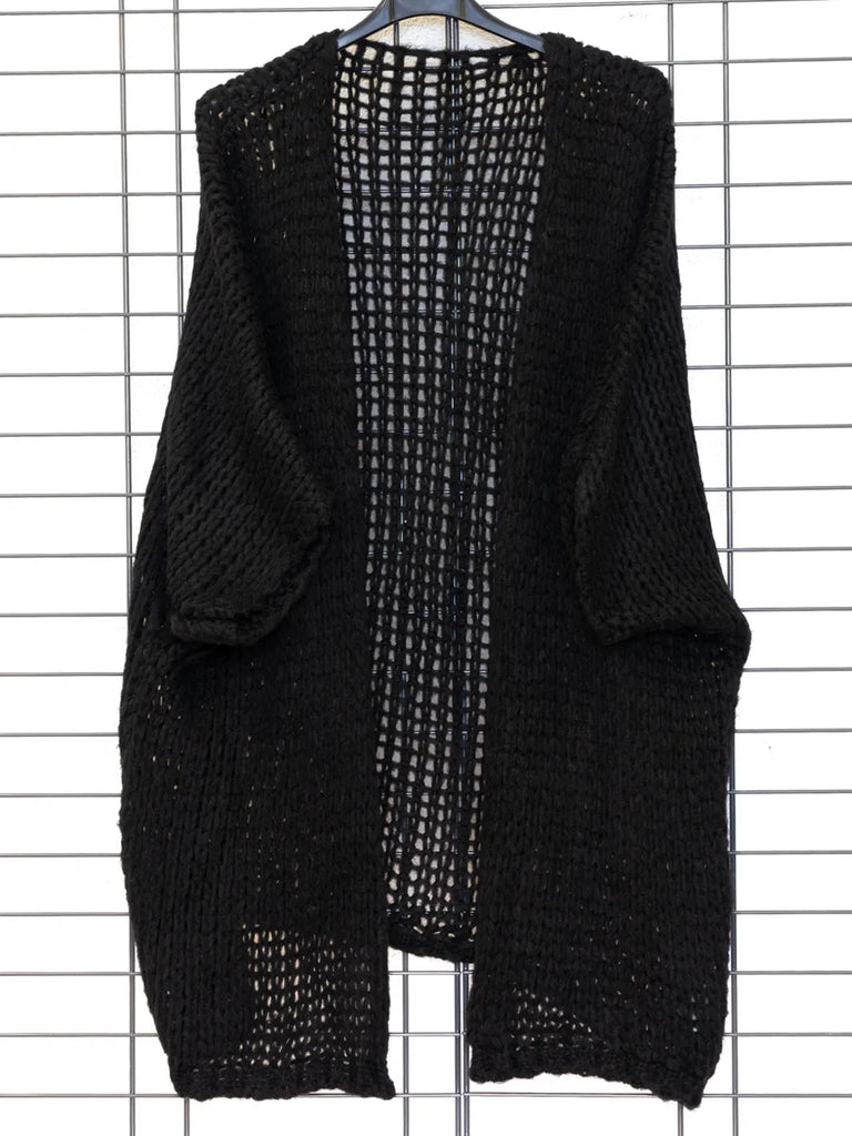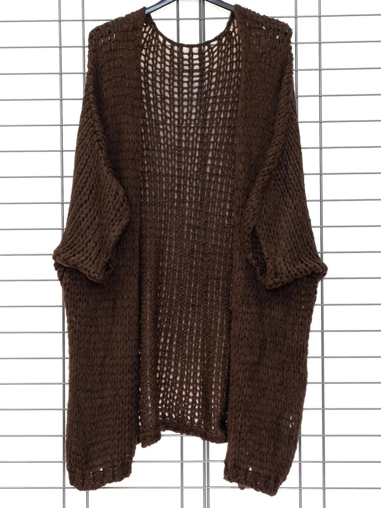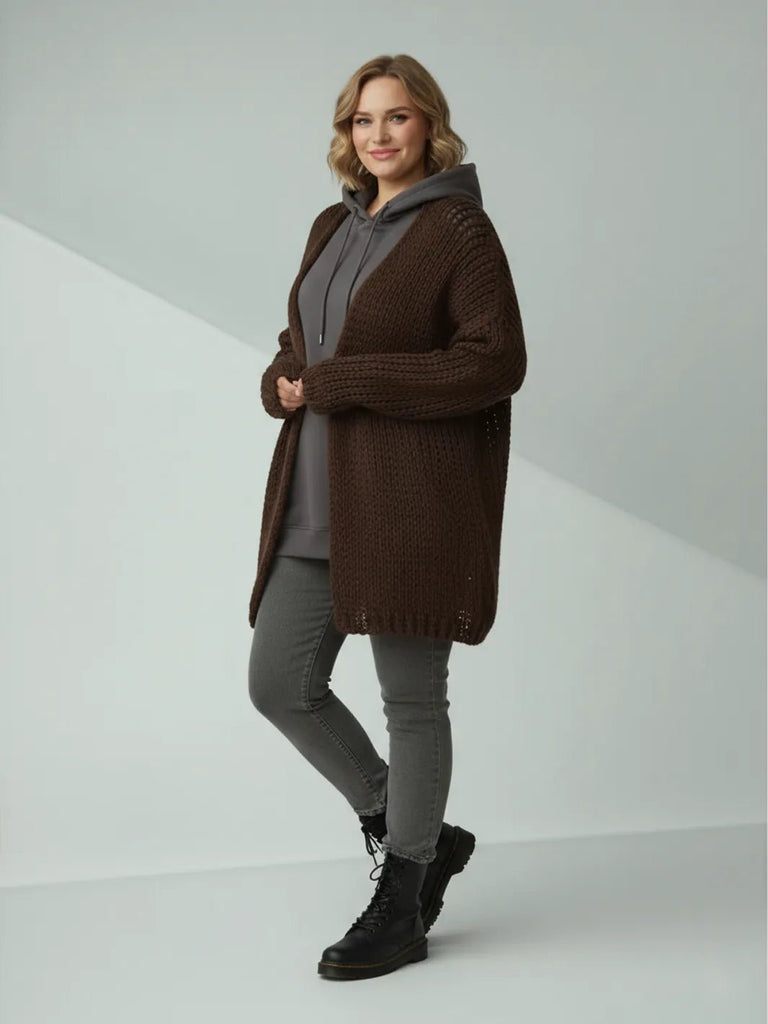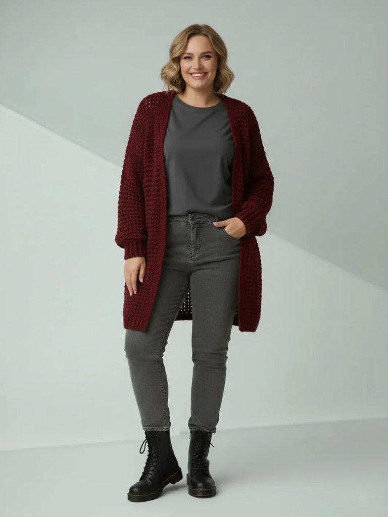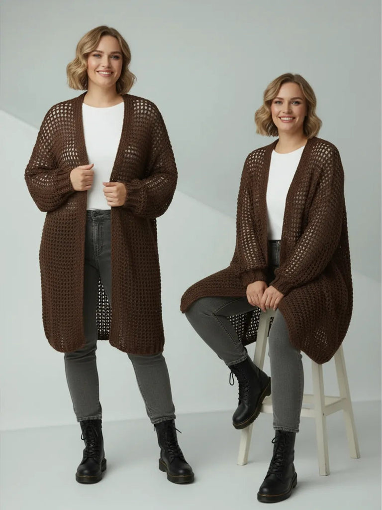 Unser Lochmuster Cardigan Cozy ist ein echtes Wohlfühlteil für alle Curvys, die Mode in Großen Größen lieben. Der grob gestrickte Look mit offenem Mesh-Muster sorgt für einen coolen, luftigen Style, während das weiche Material für ein rundum gemütliches Tragegefühl sorgt.