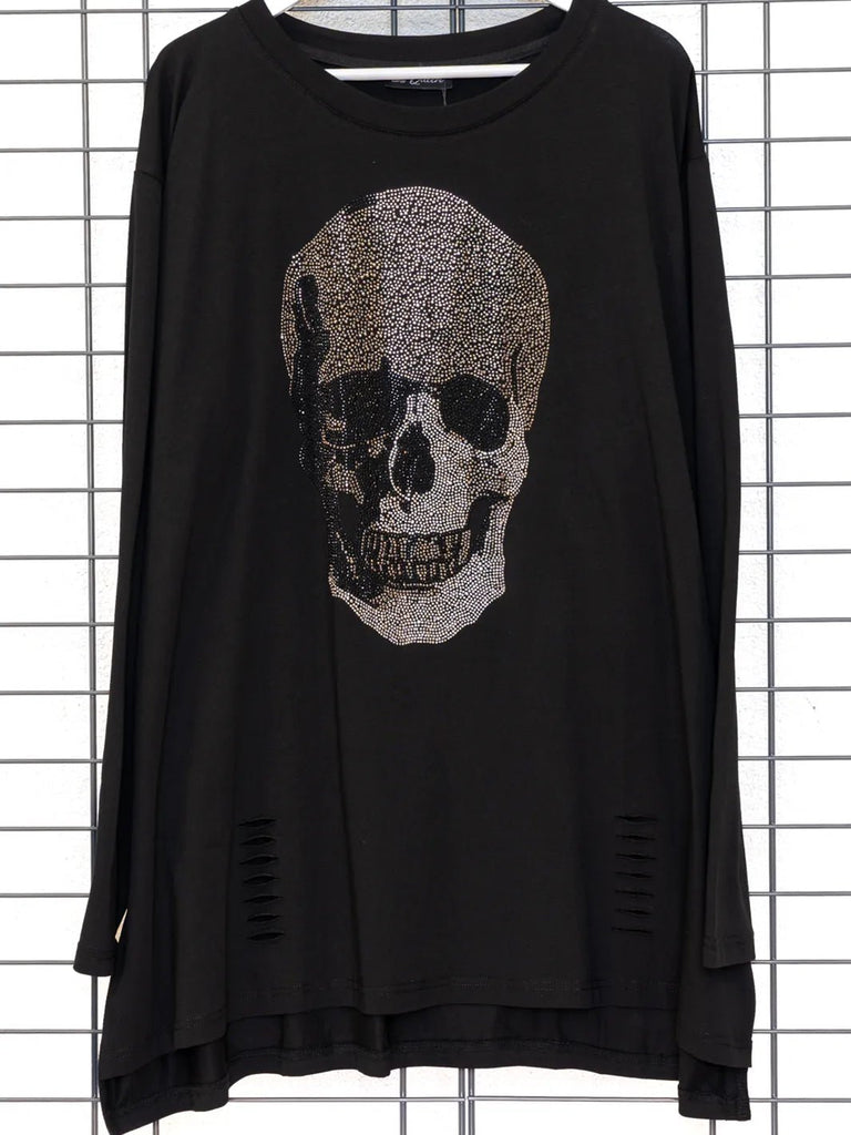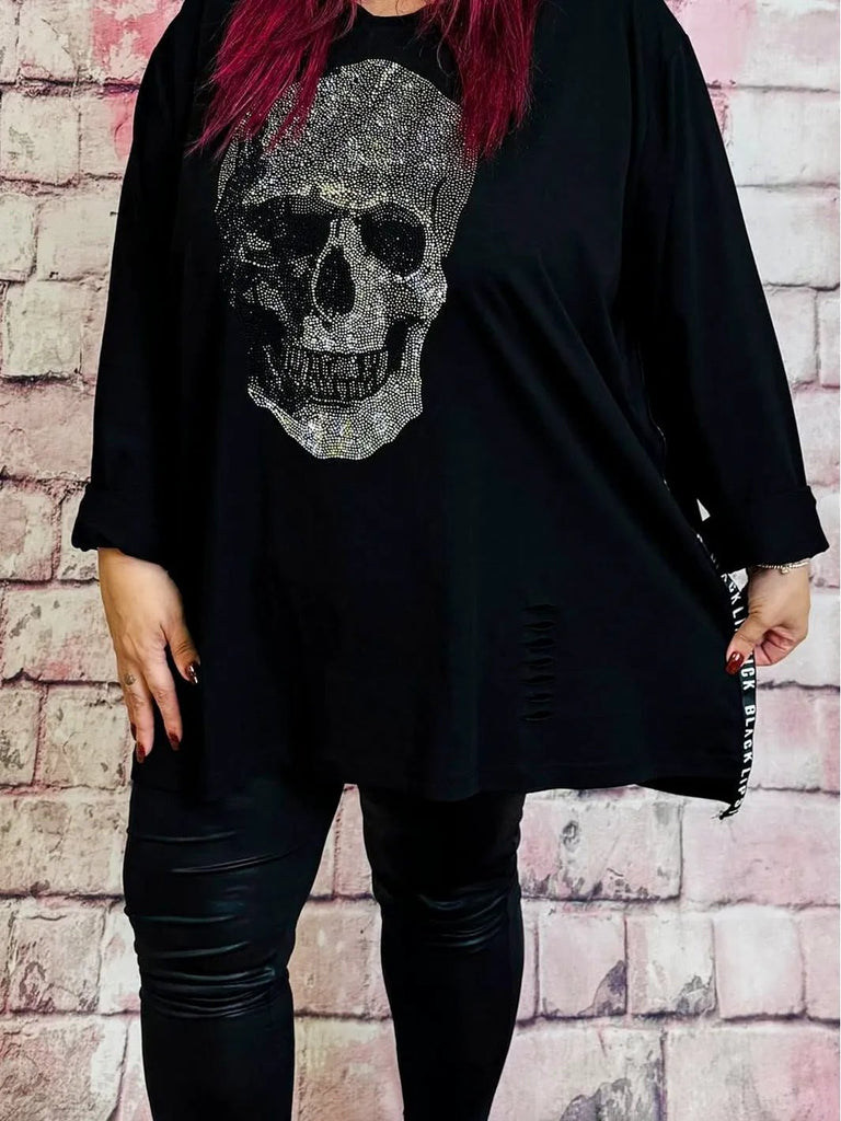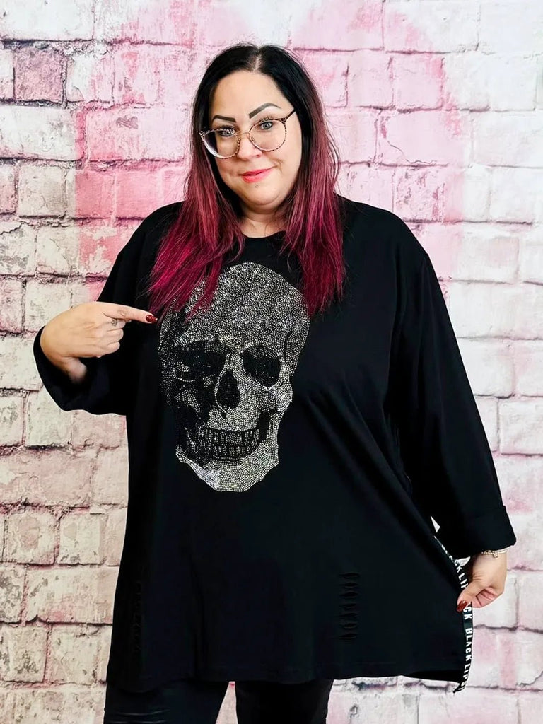 Dieses Skull-Oberteil ist dein neues Statement-Piece für Große Größen. Der großzügige Oversize-Schnitt umspielt locker die Silhouette und sorgt für ein lässiges Tragegefühl – perfekt für Curvys, die Komfort und Style verbinden möchten. Der XXL-Strass-Skull auf der Front setzt einen glitzernden Eyecatcher, während kleine Cutouts/Destroyed-Details und ein seitlicher Schriftzug dem Design eine rockige Note verleihen. Aus reiner Baumwolle gefertigt, trägt sich das Shirt angenehm weich auf der Haut und ist ideal für deinen Alltags-Look – von Denim bis Lederleggings.