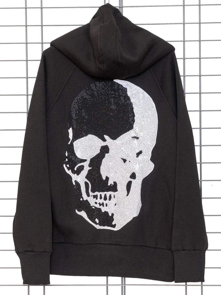 Auf den ersten Blick schlicht, zeigt sich auf der Rückseite der wahre Eyecatcher: ein XXL Skull aus funkelnden Strasssteinen! Damit wirst du garantiert zum Blickfang – ganz egal, ob du sie lässig mit Jeans kombinierst oder über dein Lieblingsshirt trägst.