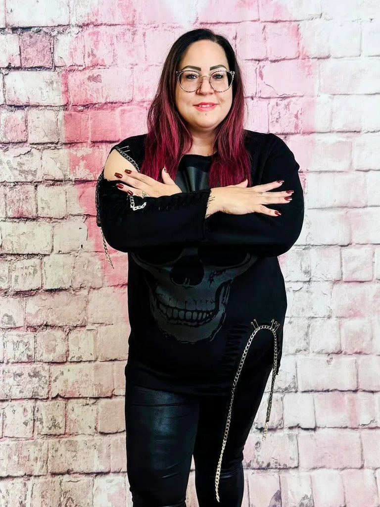 Dieses Skull Oberteil ist ein echtes Statement-Piece für alle, die Curvy Mode in Großen Größen lieben und mit außergewöhnlichem Stil auffallen wollen. Der markante Skull-Print mit Piercing-Detail, kombiniert mit Ketten, Sicherheitsnadeln und Cutouts, verleiht diesem Teil einen einzigartigen Destroy-Look – perfekt für selbstbewusste Curvys mit rockigem Herz.