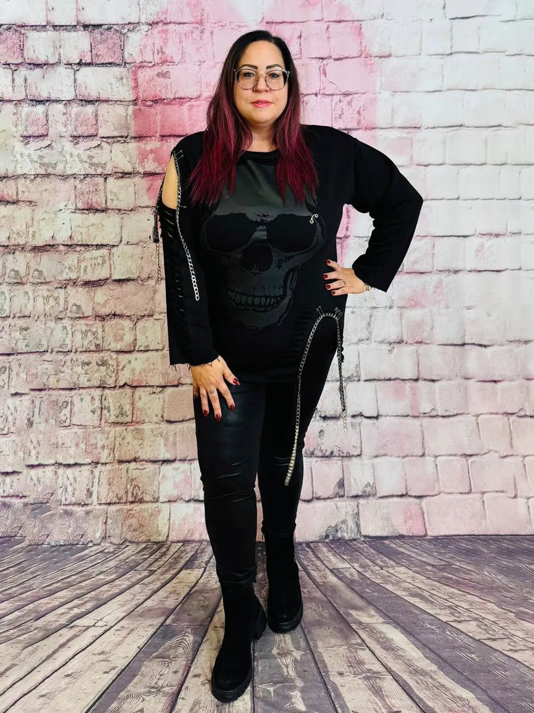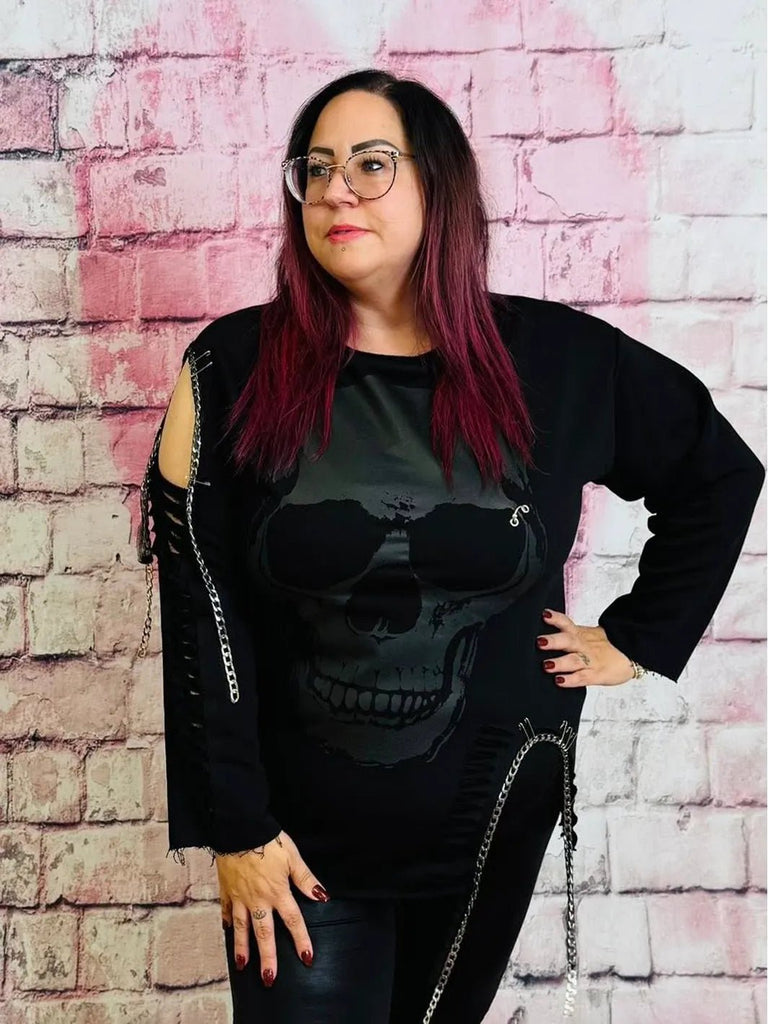 Skull Oberteil mit Ketten & Cutouts – Rockige Curvy Mode in Großen Größen