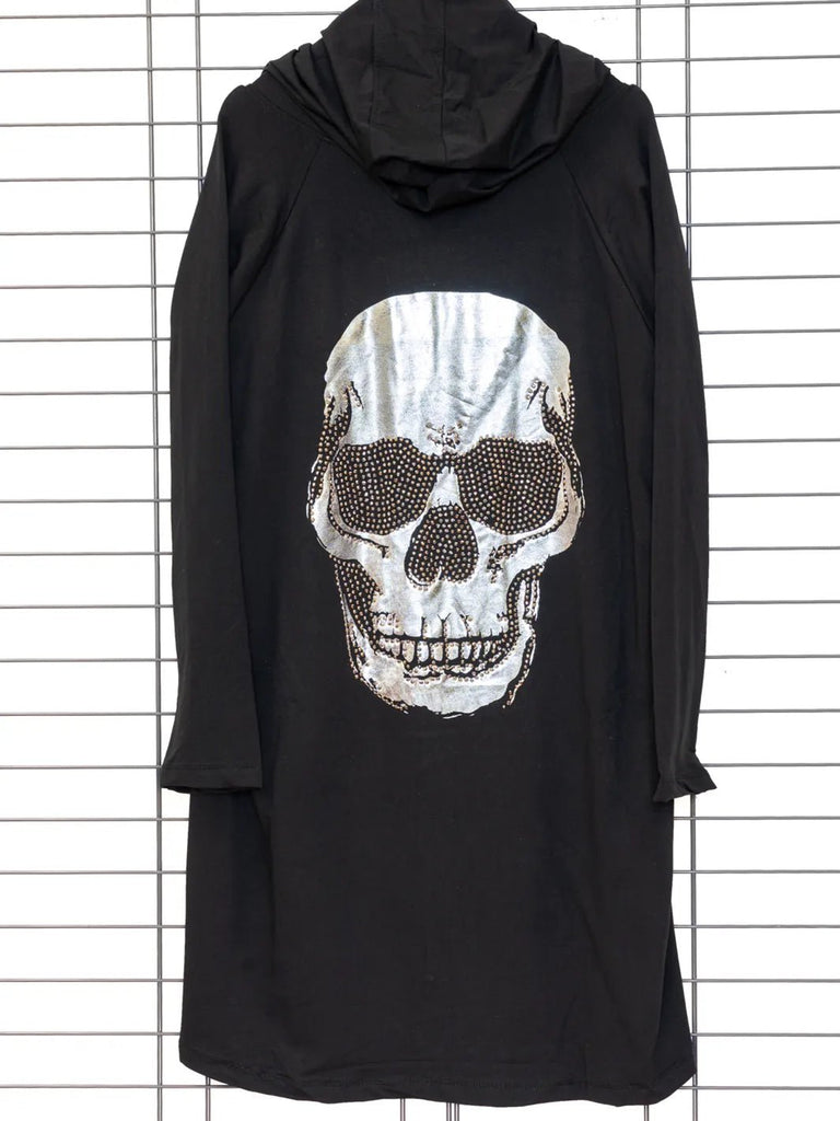 Diese Hoodielook Sweatjacke mit Skull XXL Rücken ist ein absolutes Highlight für alle Curvys, die Mode in Großen Größen lieben – stylisch, bequem und mit einem Hauch Rock’n’Roll! Die Boutique Ware ist perfekt verarbeitet, angenehm weich und mit ihrer langen, figurumspielenden Form ein echter Figurschmeichler.