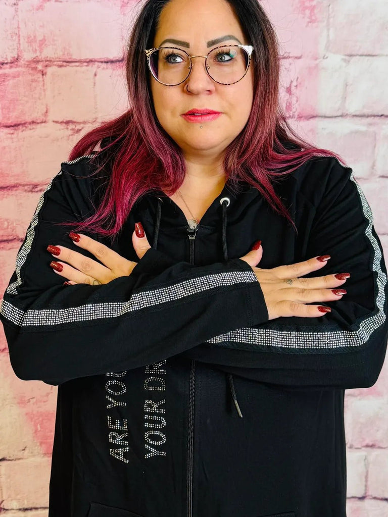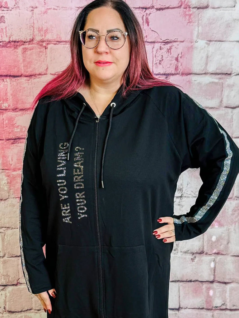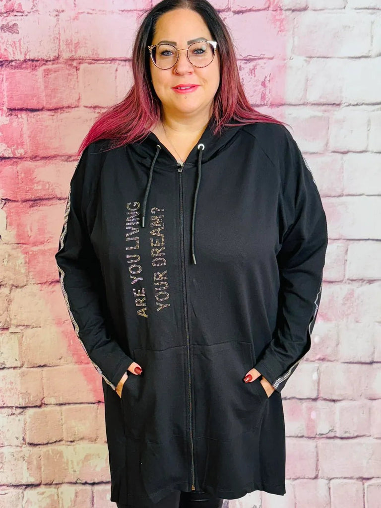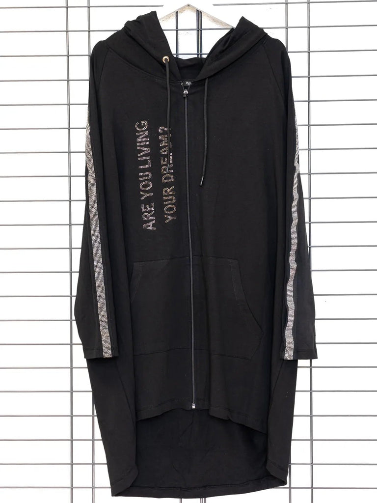 Die Boutique Ware ist aus hochwertiger Baumwolle gefertigt und bietet ein wunderbar weiches, cozy Tragegefühl. Der Reißverschluss, die Kapuzenkordel und die praktischen Eingriffstaschen machen die Jacke alltagstauglich und super bequem. Der Schriftzug „Are you living your dream?“ auf der Vorderseite sorgt für einen inspirierenden Eyecatcher, während die Strass-Dekore an den Ärmeln extra Glanz verleihen.