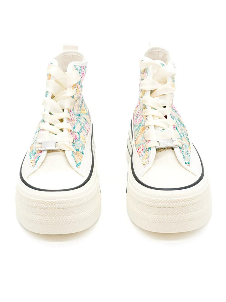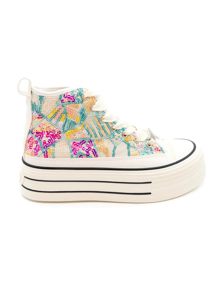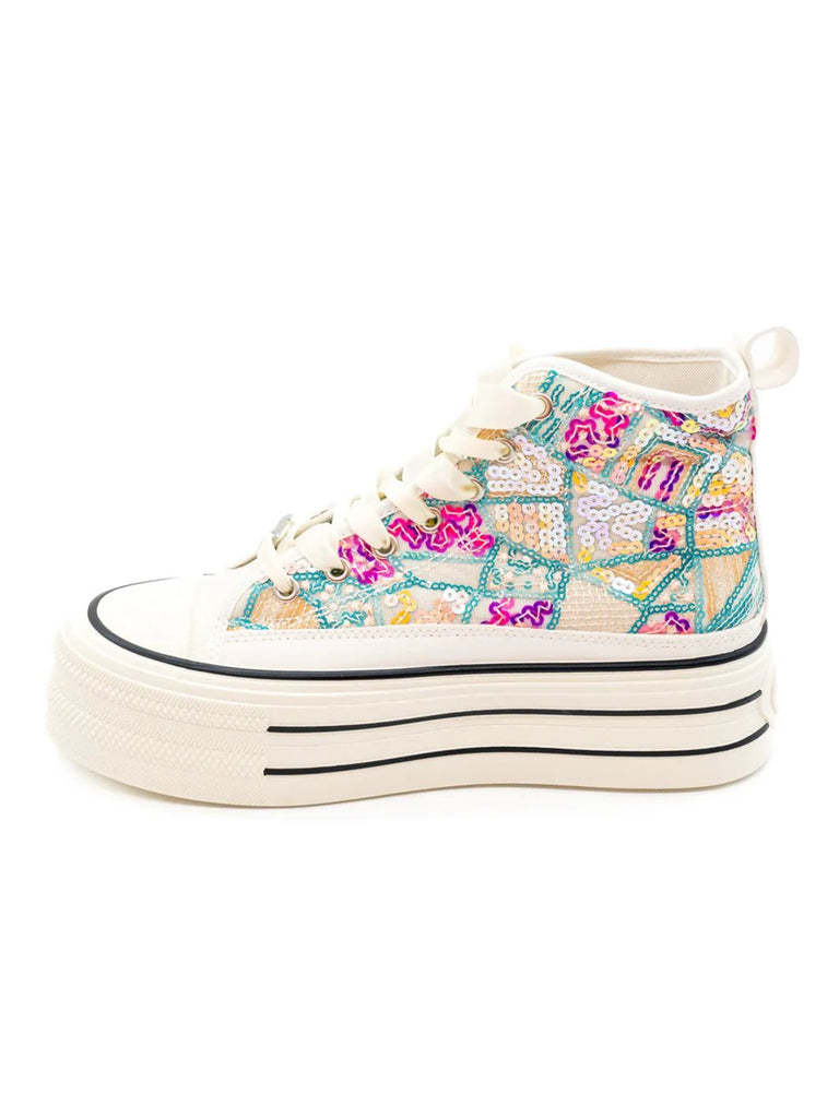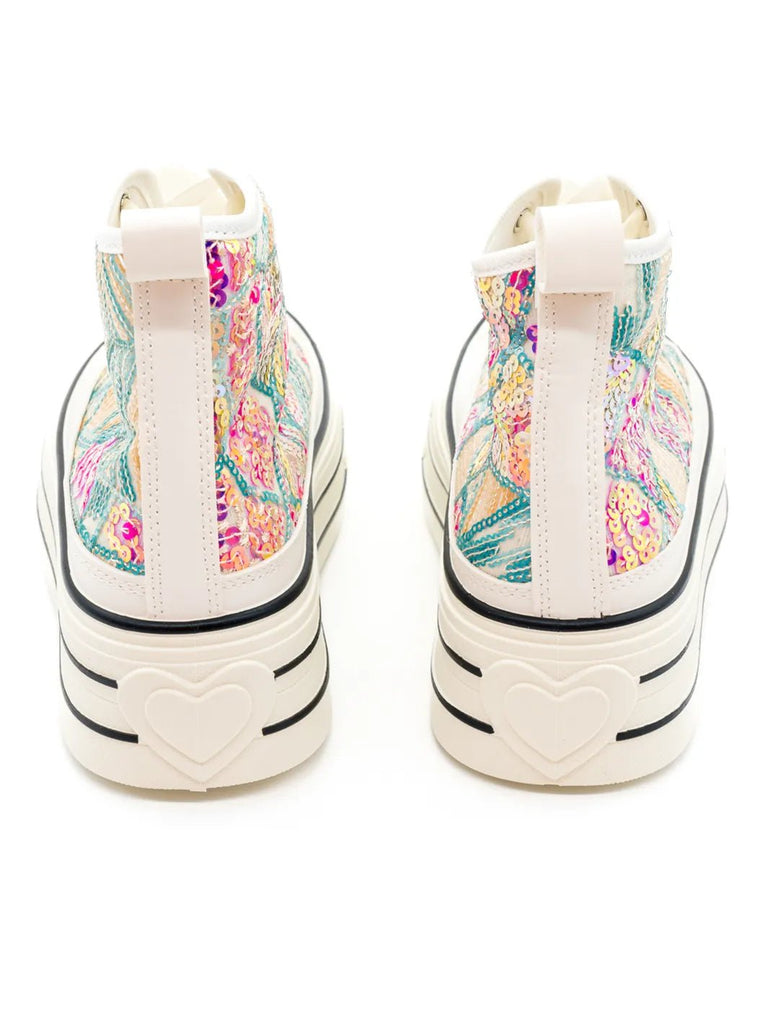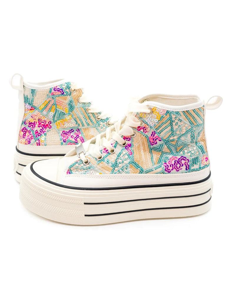 Diese High-Top Plateau Sneaker sind der perfekte Mix aus Fashion, Glamour und Komfort! Das detailverliebte Design mit farbenfroher Stickerei und funkelnden Pailletten sorgt für einen einzigartigen Look, der jedes Outfit aufwertet. Die weiche Satin-Schnürung verleiht dem Schuh einen edlen Touch – einfach zum Verlieben!